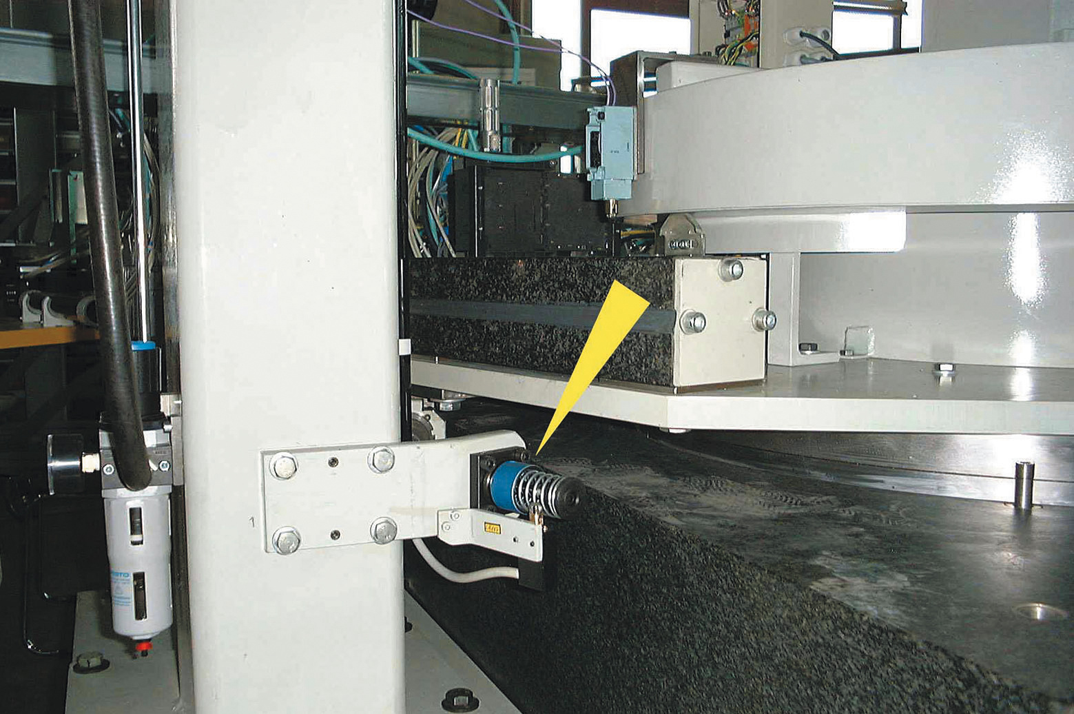 The basic mount of this coordinate measuring machine for the production of parts in the aircraft industry is made of granite and must not be damaged. To avoid damage from operating errors or mishandling, all movement axes were equipped with safety shock absorbers of ACE's productfamily SCS33 to SCS64. If the turntables malfunction the safety shock absorbers decelerate the loads before expensive damage can occur to the granite measuring tables.